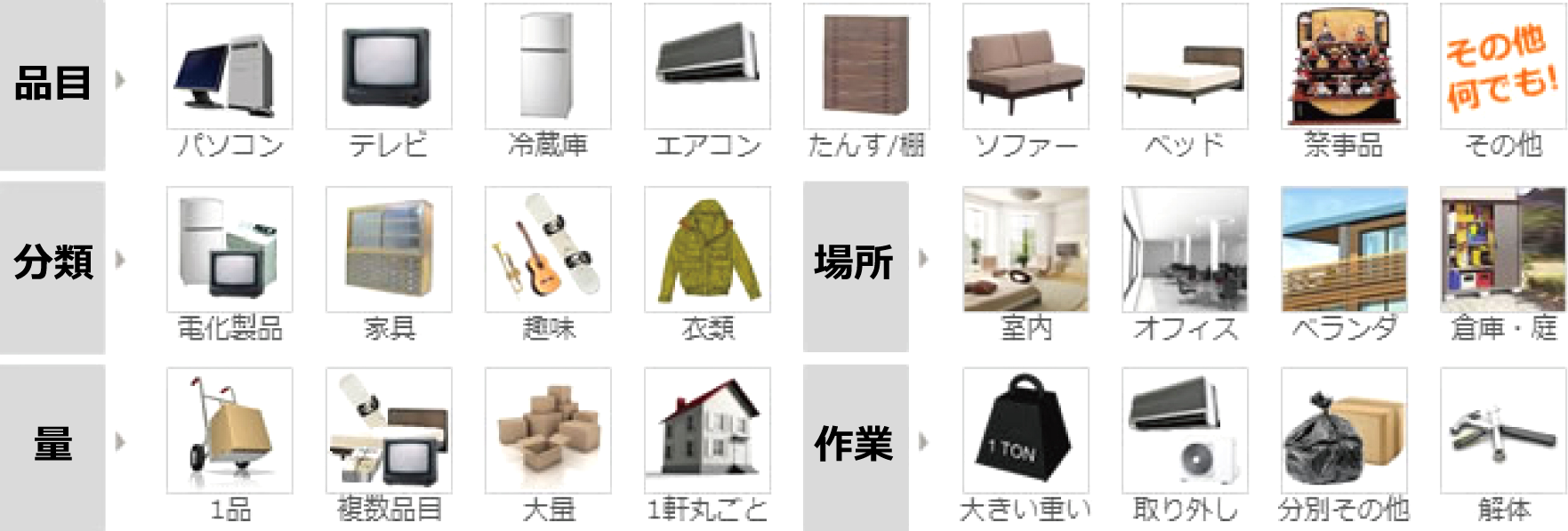 遺品整理、建物まるごと、大量および大型不用品の場合、